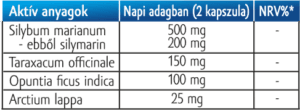 máriatövis termés kivonat (Silybum marianum), kapszulahéj [zselatin, színezék (cink-oxid)], gyermekláncfű növény kivonat (Taraxacum officinale), fügekaktusz kivonat (Opuntia ficus indica), tömegnövelő szer: mikrokristályos cellulóz, közönséges bojtorján gyökér kivonat (Arctium lappa), csomósodást gátló anyagok: magnézium-sztearát, szilícium-dioxid